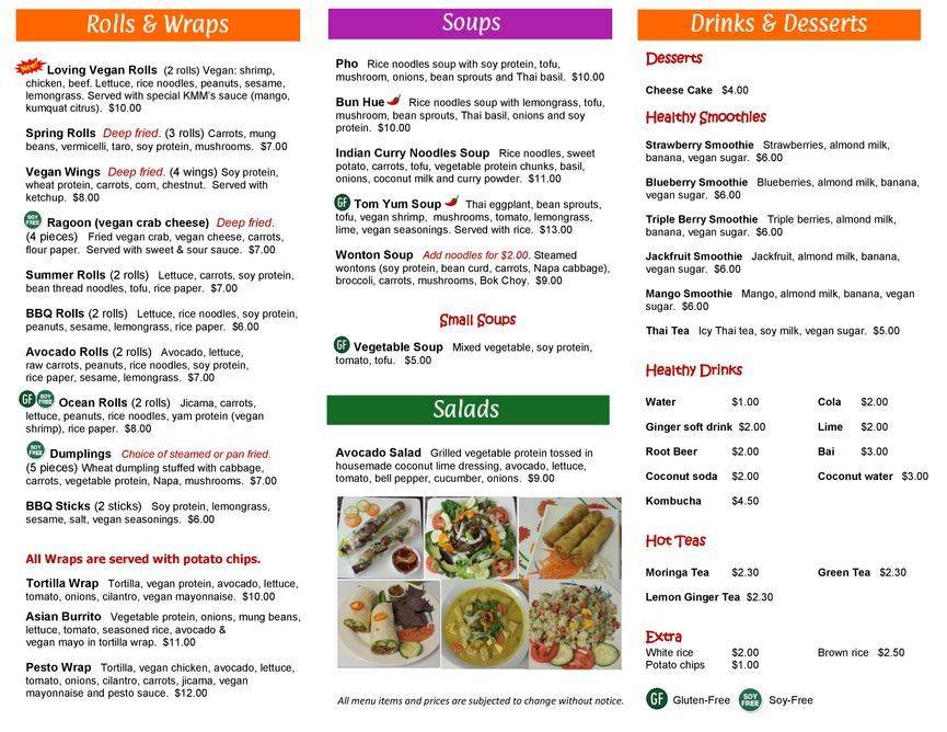 | Loving Vegan Rolls (2 rolls) | Vegan: shrimp, chicken, beef. Lettuce, rice noodles, peanuts, sesame, lemongrass. Served with special KMM’s sauce (mango, kumquat citrus). | $10.00 |